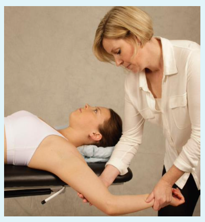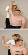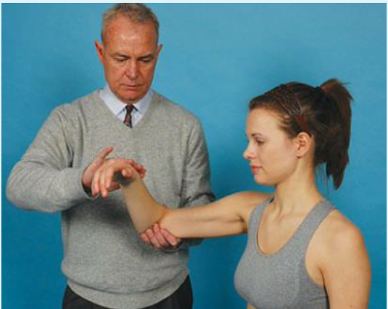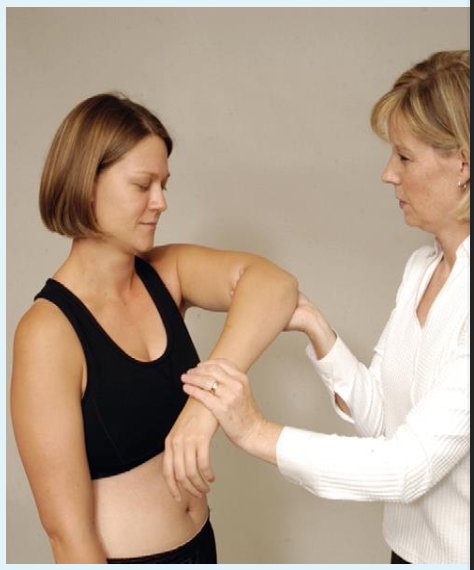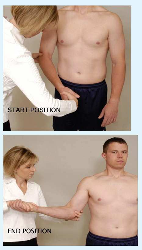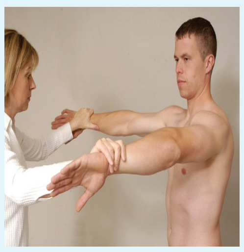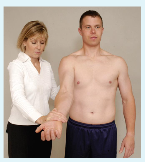 DESCRIPTION: The patient stands with the arm by the side and shoulder muscles relaxed. The examiner grasps the patient’s forearm below the elbow and pulls the arm distally