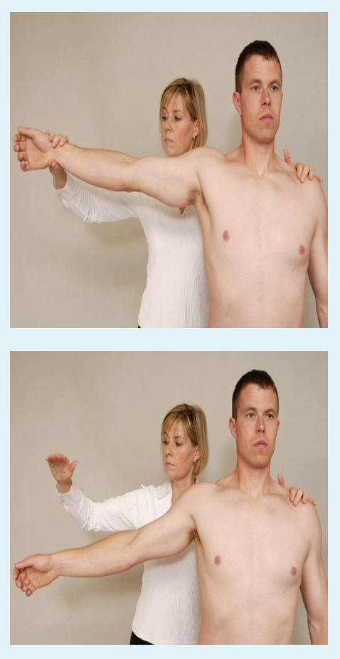 DESCRIPTION- The patient’s arm is abducted to 90° with neutral (no) rotation, and the examiner provides resistance to abduction. The shoulder is then medially rotated and angled forward 30° (“empty can” position) so that the patient’s thumbs point toward the floor in the plane of the scapula. Differentiate if pain is present between two positions