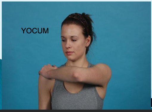 The Yocum test is a modification of the Hawkins-kennedy test in which the patient’s hand is placed on the opposite shoulder and the examiner elevates the elbow. Pain indicates a positive test