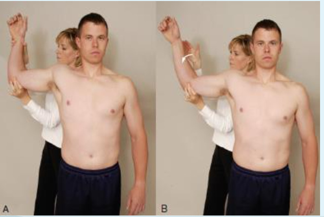 DESCRIPTION- Patient supine/ sitting. The examiner elevates the patient’s shoulder in the plane of the scapula to 90° while stabilizing the scapula with the