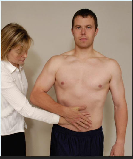 DESCRIPTION: The patient is standing, examiner places a hand on the abdomen below the xiphoid process so that the examiner can feel how much pressure the patient is applying to the abdomen. The patient places his hand of the shoulder being tested on the examiner’s hand and pushes the hand as hard as he can into the stomach (medial shoulder rotation). While pushing the hand into the abdomen, the patient attempts to bring the elbow forward to the scapular plane, causing greater medial shoulder rotation.