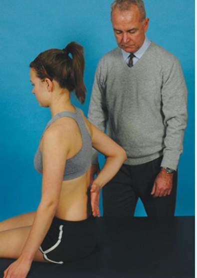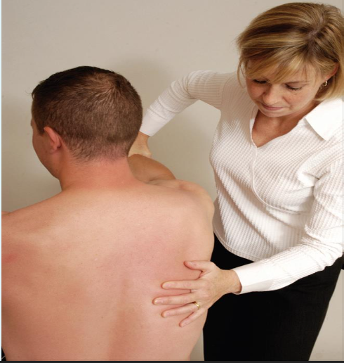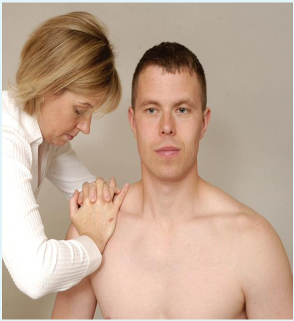 DESCRIPTION- With the patient in the sitting position, the examiner cups his or her hands over the deltoid muscle with one hand on the clavicle and one hand on the spine of the scapula. The examiner then squeezes the heels of the hands together