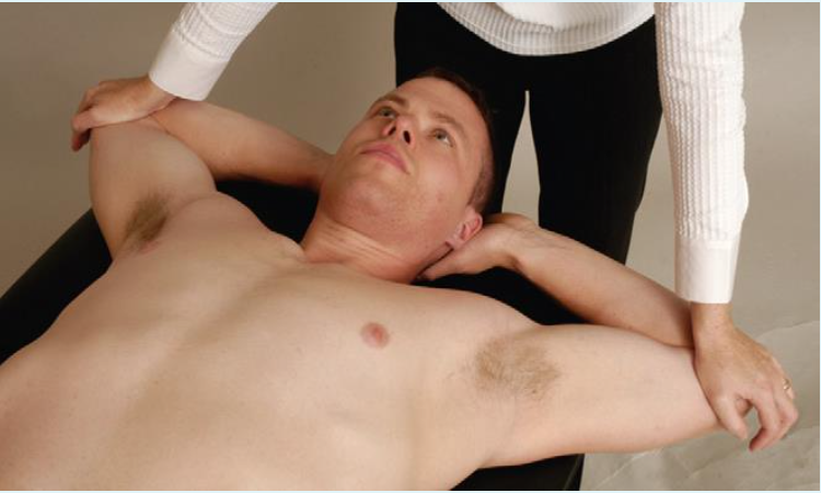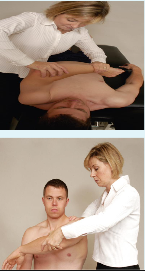 DESCRIPTION- The patient is placed in the supine lying position. The examiner passively abducts the shoulder to 90° to 110°, with 15° to 20° extension and maximum lateral rotation