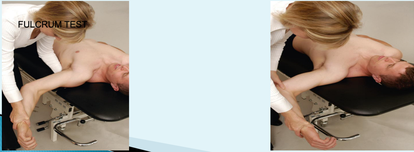 DESCRIPTION- Patient supine, the examiner abducts the arm to 90° and laterally rotates the patient’s shoulder slowly. By placing a hand under the glenohumeral joint to act as a fulcrum, the apprehension test becomes the fulcrum test