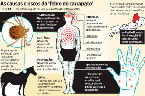 Agente: Rickettsia rickettsii // Reservatório: carrapatos Amblyomma (SE, SUL, BA, DF)