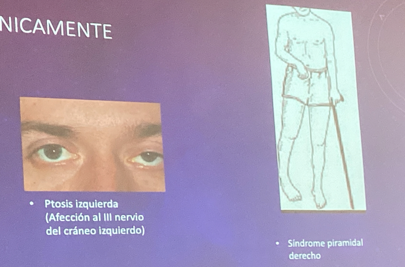 Ptosis izq (nervio craneal izq afectado) y sx piramidal derecho (afección motora derecha)