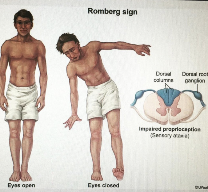 Es la capacidad de mantenerse en una misma posición al quitarle la visión (no sabe donde están sus pies (propiocepcion)) si se desbalancea o siente que se caerá = +