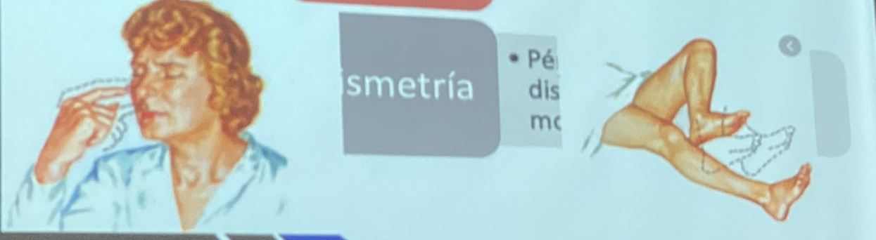 Dismetria (no mide las distancias), px toque su nariz y separar dedo. O de la rodilla talón.