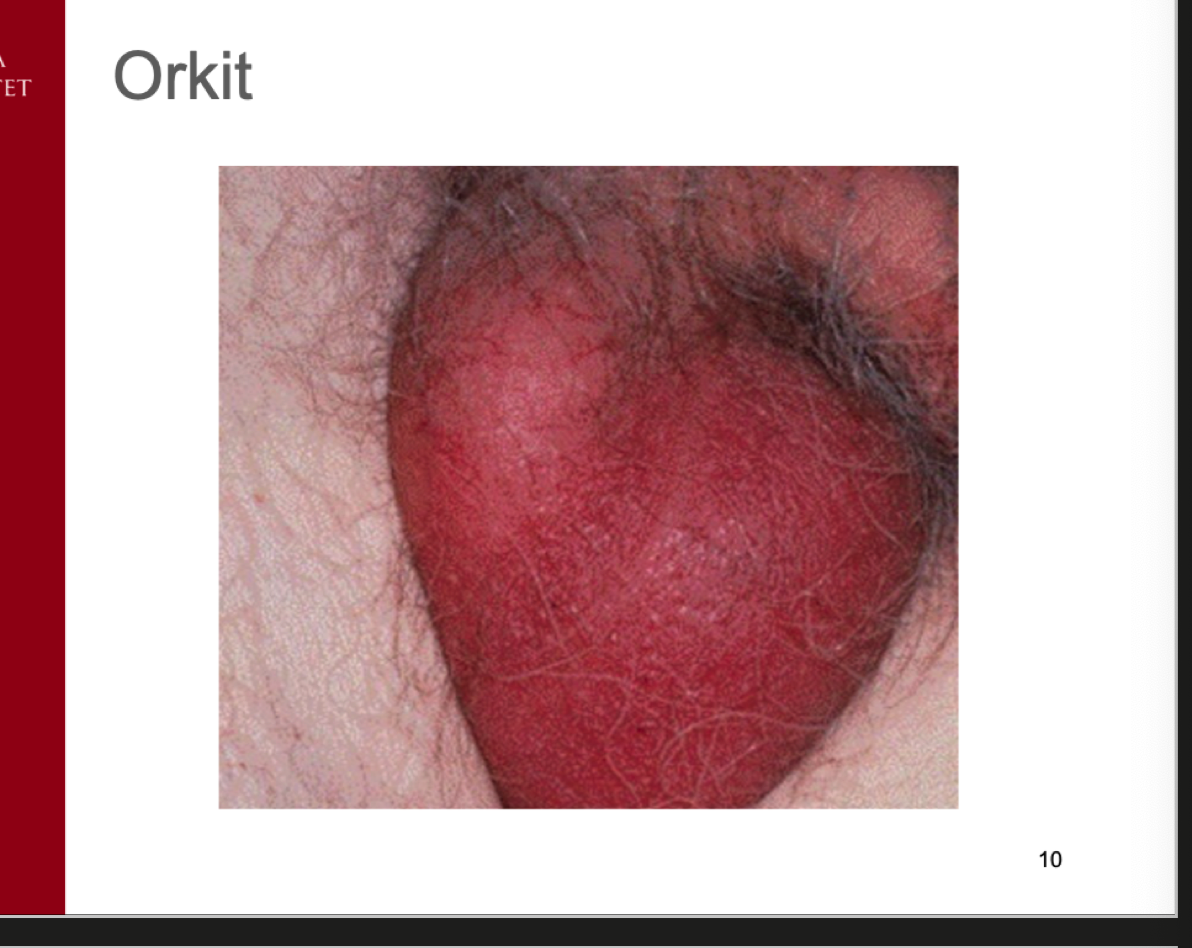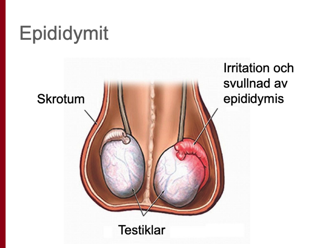 Man i 45 års ålder söker akuten. Molande värk i pungen som blivit värre under några dagar. Sveda vid miktion. Feber, ömhet över bistestikel vid palpation.