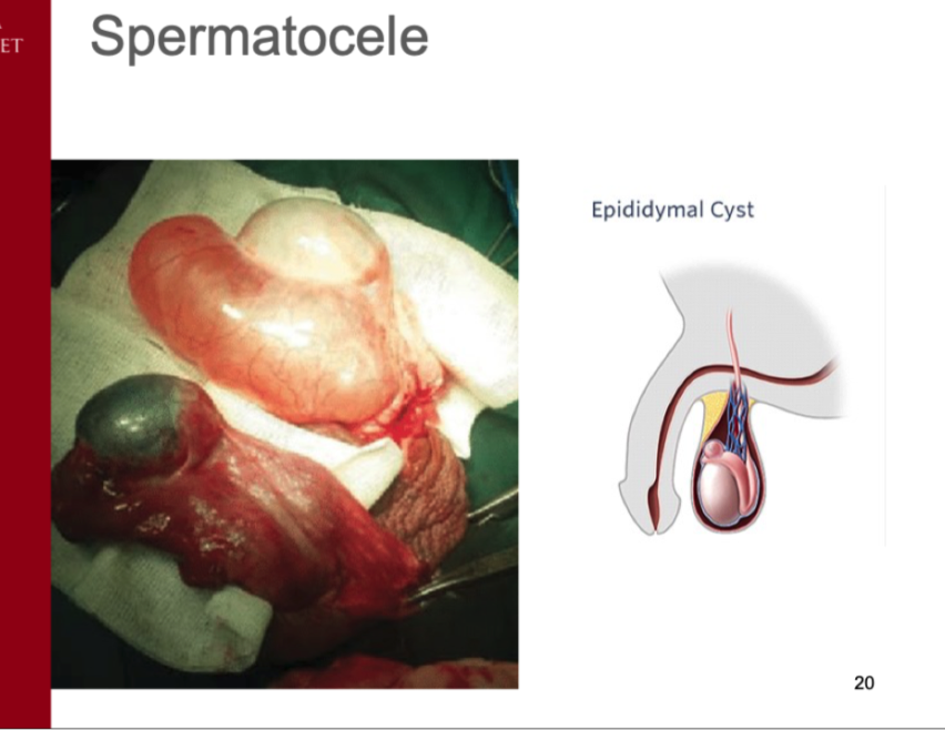 Spermatocele är cystbildning i rete testis - bildar en förkalkad liten cyst där spermier fastnar.
