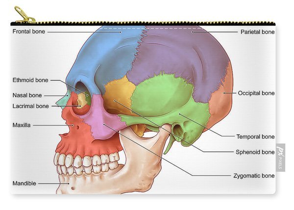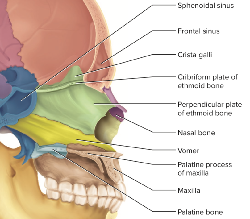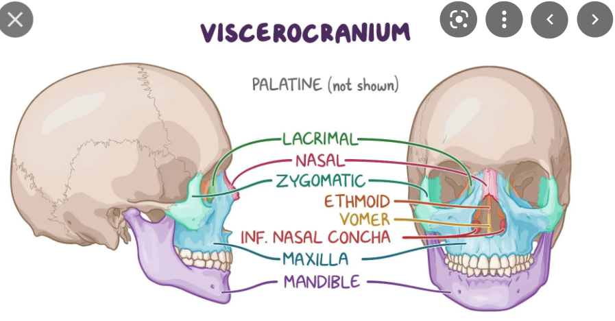 2x lacrimal, 2x zygomatic, 2x inferior nasal conchiae, 2x maxilla, 2x nasal, 2x palatine, vomer, mandible