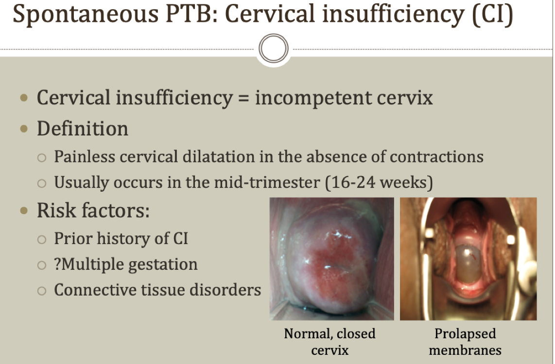 Cervical insufficiency is an incompetent cervix defined as painless cervical dilatation in the abscence of contractions usually occurring in the mid-trimester (16-24 weeks)