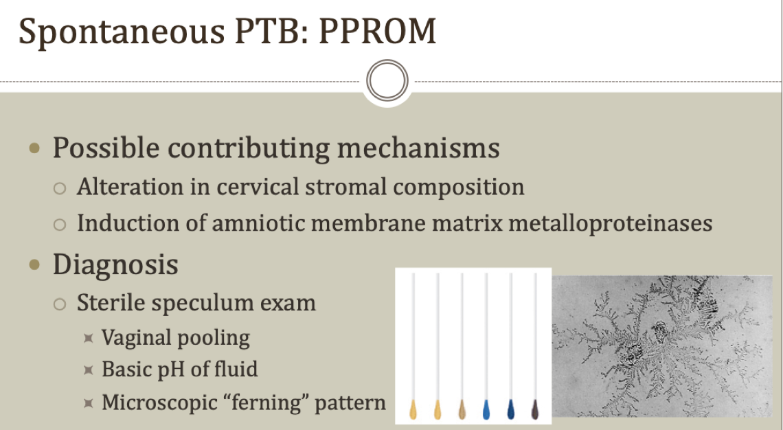 Preterm premature rupture of membranes (PPROM) diagnosis involves sterile speculum exam