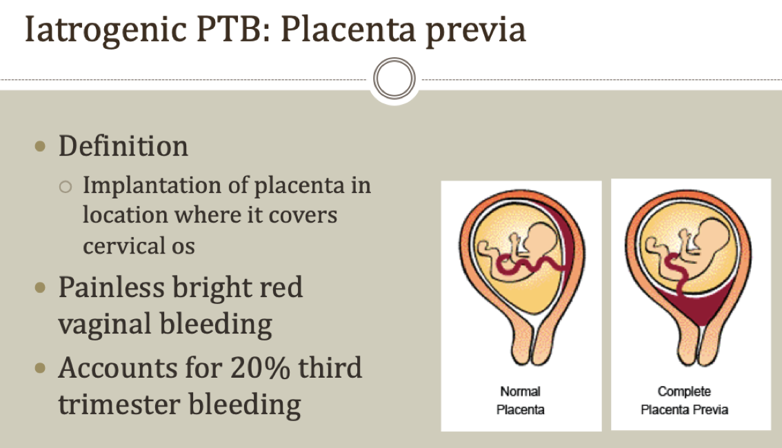 Placenta previa is implantation of placenta in a location where it covers the cervical os that presents with painless bright red vaginal bleeding