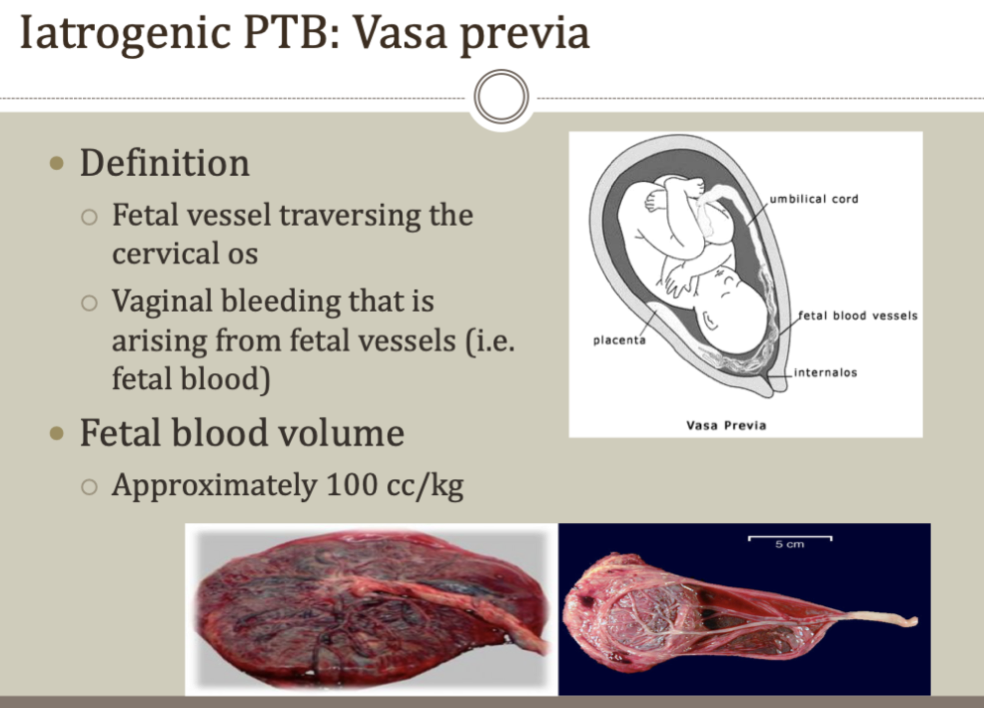 Vasa previa is a fetal vessel transversing the cervical os that presents with vaginal bleeding that is arising from fetal vessels (i.e. fetal blood)
