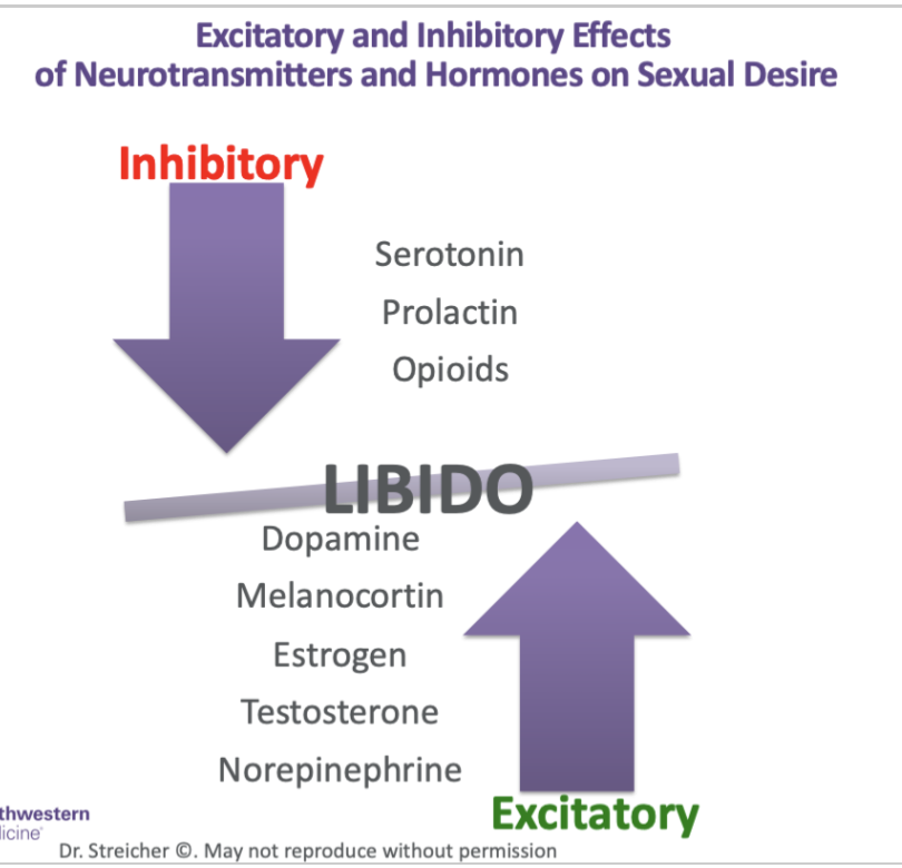Dopamine, melanocortin, estrogen, testosterone, and NE excite libido