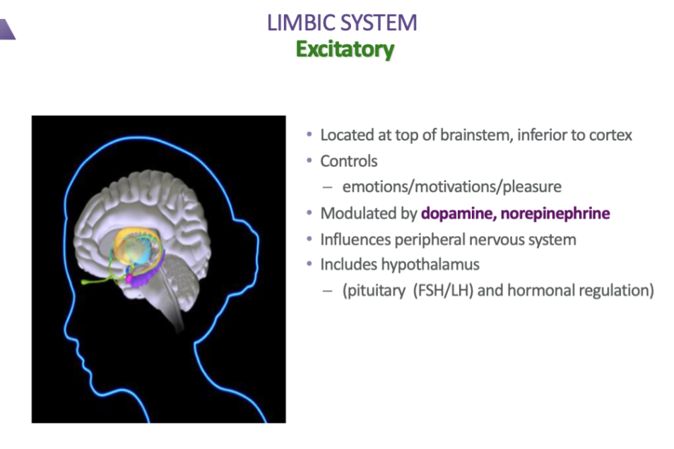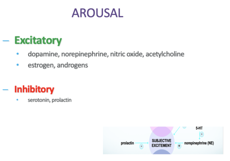 Dopamine, NE, NO, ACh, estrogen, and androgens excite arousal