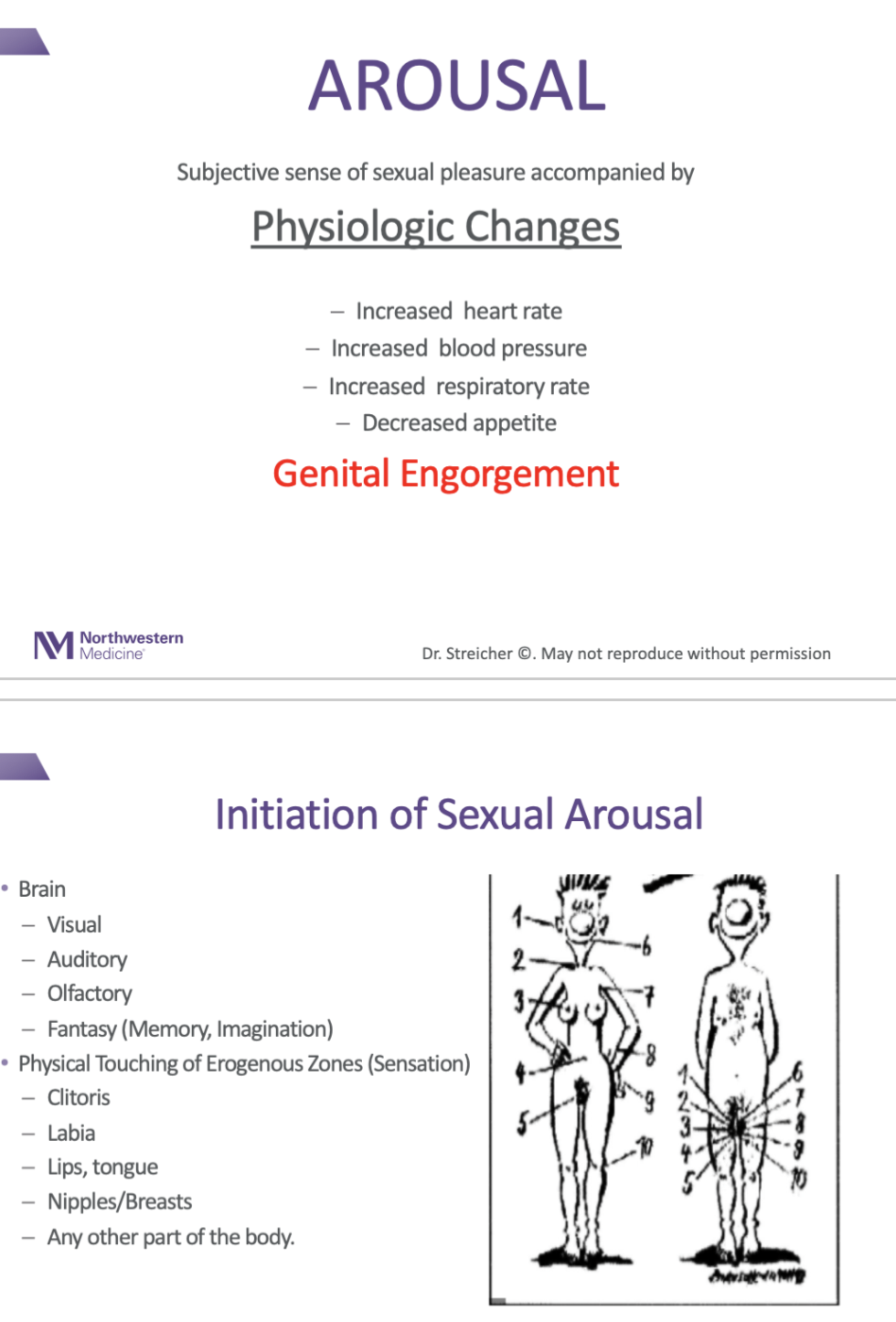 Arousal is a subjective sense of sexual pleasure accompanied by physiologic changes such as genital engorgement