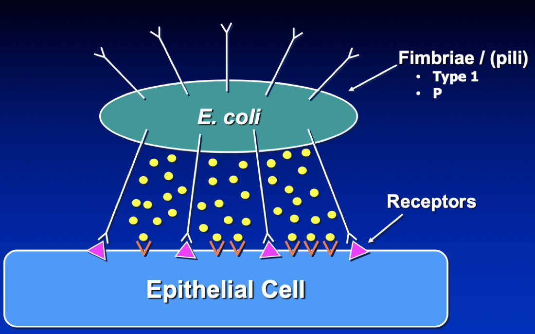 E. coli adheres to epithelial cells through fimbriae (pili)