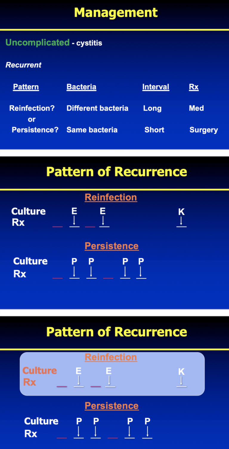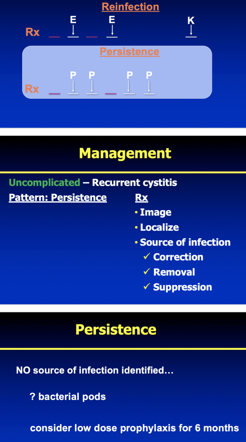 UTI can be first / isolated, unresolved, or recurrent (reinfection or persistence)