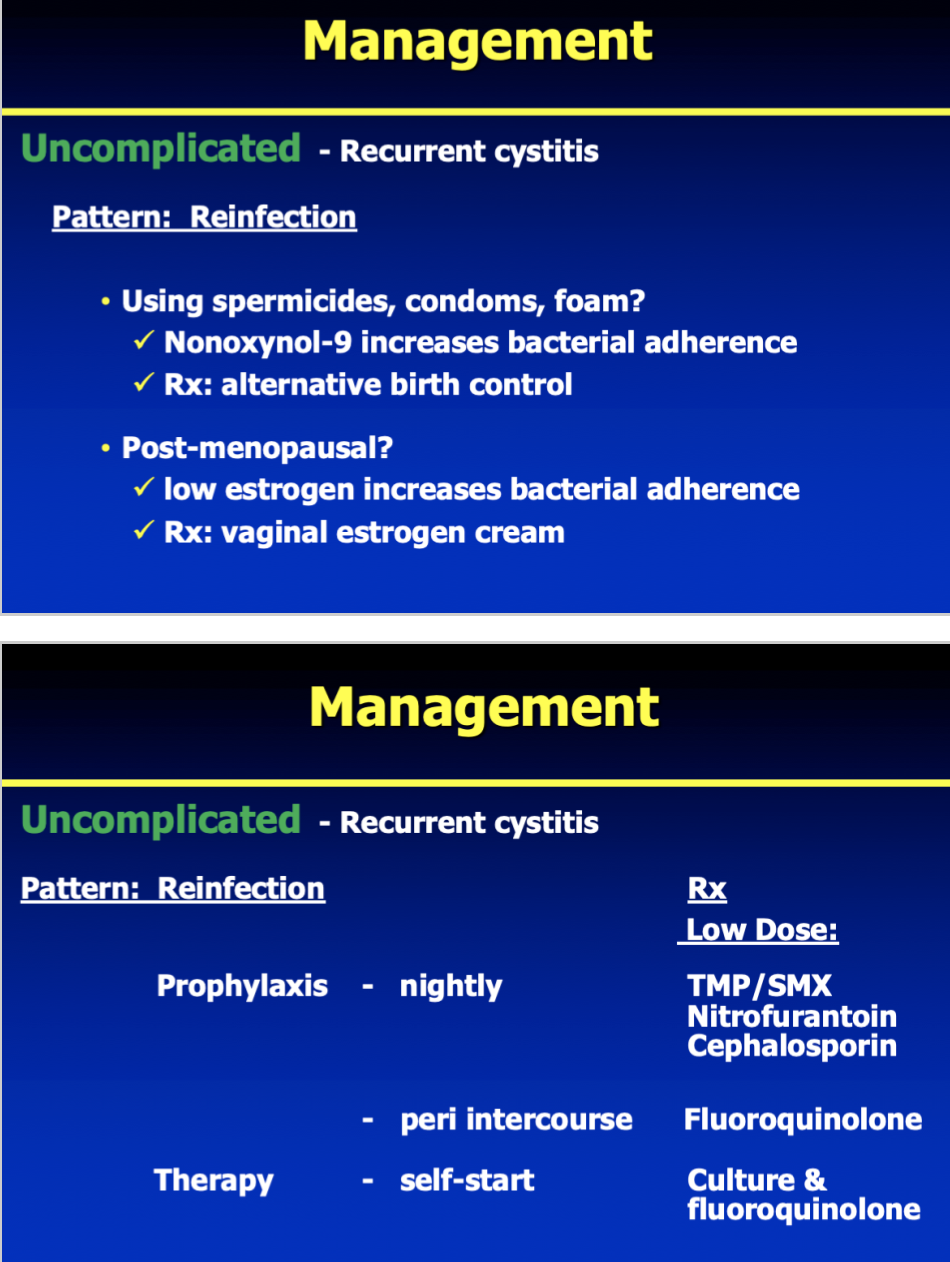Describe management of uncomplicated recurrent cystitis due to recurrence