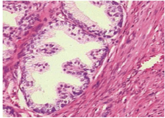 This is a normal prostate acinus and surrounding stroma