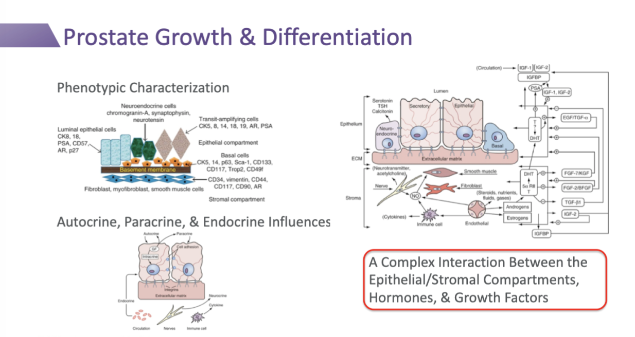 Prostate growth and differentiation is a complex interaction between the epithelial / stromal components, hormones, and growth factors