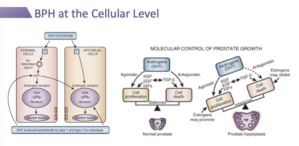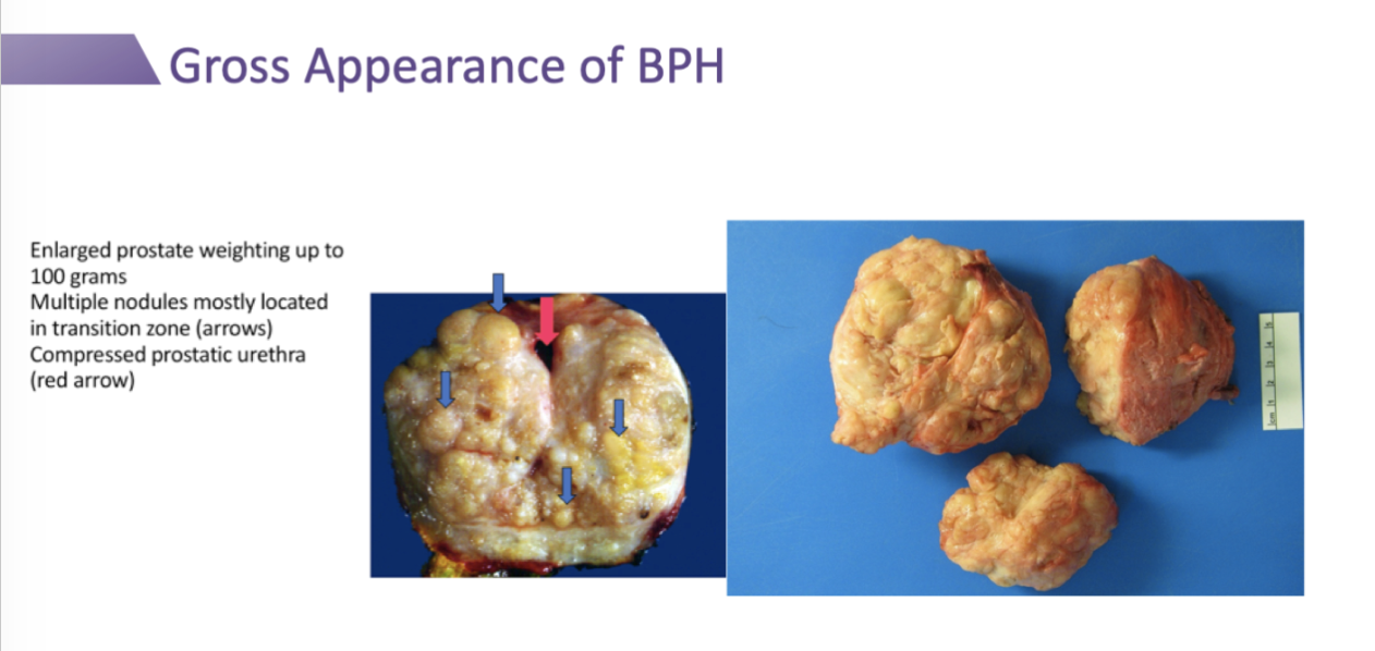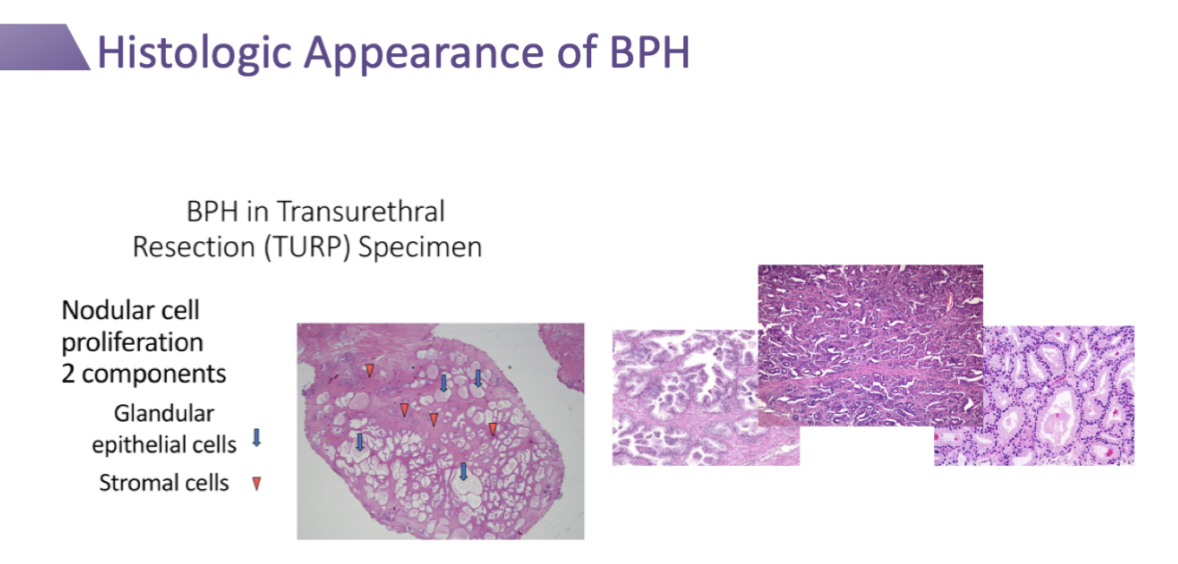 BPH has nodular cell proliferation with glandular epithelial cells and stromal cells