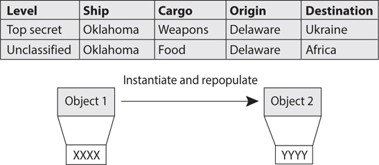 B. Polyinstantiation is the simultaneous existence of multiple information objects, which refer to the same real-world concept but differ by their classification level and/or their contents. The multiple instances are commonly distinguished by their security levels. Polyinstantiation is when more than one copy of an object is made, and the other copy is modified to have different attributes. This can be done for several reasons. A way to use polyinstantiation is for security purposes, to ensure that a lower-level subject could not access an object at a higher level. If a lower-level subject does not have the clearance of top secret, then it should not be able to access data at this classification level. Images A is incorrect because polymorphism is the capability of different objects to respond differently to the same message. This is possible because objects can belong to different classes, meaning they will exhibit different behaviors. Polymorphism can take place in the following example: Object A and Object B are created from the same parent class, but Object B is also under a subclass. Object B would have some different characteristics from Object A because of this inheritance from the parent class and the subclass. When Object A and Object B receive the same input, they would result in different outputs because only one of them inherited characteristics from the subclass. An analogy of polymorphism is if someone gave you and Joe the same message and Joe responded with X and you responded with Y—so the same input and different outputs. Images C is incorrect because cohesiveness means that one module is carrying out only one task. If a module is highly cohesive, this means that all elements in the module directly deal with the one basic task the module carries out, or a group of similar tasks. A module should have well-defined responsibilities, which means that it has high cohesiveness. If you were a highly cohesive module, you would carry out your one specific task you were built to do, for example, taking out the trash. Images D is incorrect because an object class is a blueprint or prototype that defines the variables (data) and methods (procedures) common to all objects within it. A class provides a type of empty template of variables that will be populated when the object is instantiated. Objects are members, or instances, of classes. A real-world object, such as a table, is a member (or an instance) of a larger class of objects called “furniture.” The furniture class will have a set of attributes associated with it, and when an object is generated, it inherits these attributes. The attributes may be color, dimensions, weight, style, and cost. These attributes apply if a chair, table, or loveseat object is generated or instantiated. Because the table is a member of the class furniture, the table inherits all attributes defined for the class.