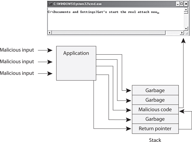 D. A buffer is an area reserved by an application to store something in it, like some user input. After the application receives the input, an instruction pointer points the application to do something with the input that’s been put in the buffer. A buffer overflow occurs when an application erroneously allows an invalid amount of input to be written into the buffer area, overwriting the instruction pointer in the code that told the program what to do with the input. Once the instruction pointer is overwritten, whatever code has been placed in the buffer can then be executed, all under the security context of the application. Images A is incorrect because traffic analysis is a method of uncovering information by watching traffic patterns on a network. For example, heavy traffic between the HR department and headquarters could indicate an upcoming layoff. Another example is if there is a lot of traffic between two military units, this may indicate that a military attack is being planned. Traffic padding can be used to counter this kind of attack, in which decoy traffic is sent out over the network to disguise patterns and make it more difficult to uncover them. Images B is incorrect because it does not depict a race condition attack. When two different processes need to carry out their tasks on a resource, they need to follow the correct sequence. Process one needs to carry out its work before process two accesses the same resource and carries out its tasks. If process two goes before process one, the outcome could be very different. If an attacker could manipulate the processes so that process two did its thing first, she is controlling the outcome of the processing procedure, which is referred to as a race condition attack. Images C is incorrect because in a covert storage channel, processes are able to communicate through some type of storage space on the system. For example, System A is infected with a Trojan horse that has installed software that will be able to communicate to another process in a nefarious way. System A has a very sensitive file (File 2) that is of great interest to a particular attacker. The software the Trojan horse installed is able to read this file and it needs to send the contents of the file to the attacker, which can only happen one bit at a time. The intrusive software is going to communicate to the attacker by locking a specific file (File 3). When the attacker attempts to access File 3 and finds it has a software lock enabled on it, the attacker interprets this to mean the first bit in the sensitive file is a 1. The second time the attacker attempts to access File 3, it is not locked. The attacker interprets this value to be zero. This continues until all of the data in the sensitive file is sent to the attacker.