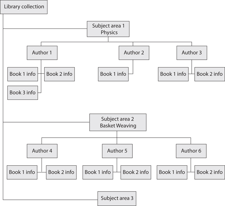 There are several different types of databases. Which type does the graphic that follows illustrate? Library collection —Subject area 1 Physics —–Author 1 ——–Book 1 info ——–Book 2 info ——–Book 3 info —–Author 2 ——–Book 1 info —–Author 3 ——–Book 1 info ——–Book 2 info —Subject area 2 Basket Weaving —–Author 4 ——–Book 1 info ——–Book 2 info —–Author 5 ——–Book 1 info ——–Book 2 info —–Author 6 ——–Book 1 info ——–Book 2 info A. Relational B. Hierarchical C. Network D. Object-oriented