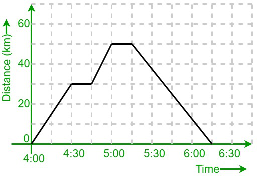 Owais leaves his home at 4:00pm and travels 30km in 30 minutes. He then stops for fuel for 15 minutes. He then travels 20km in 15 minutes. He then stops at his friend’s house for 15 minutes. He then leaves and gets back to his house at exactly 6:15pm.