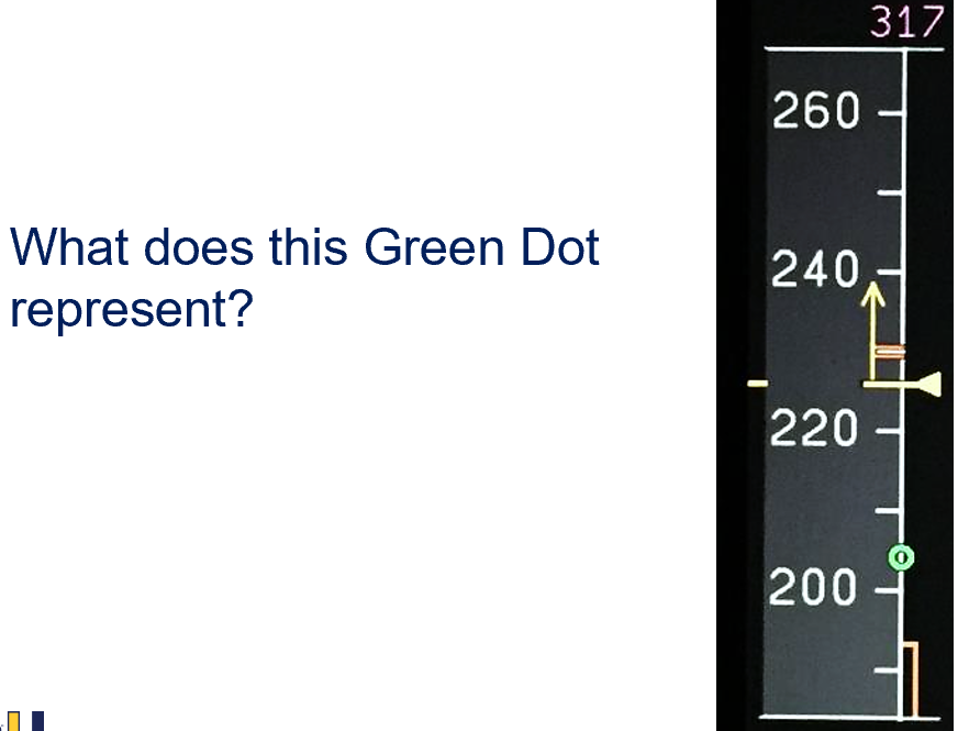 Green Dot Speed is best lift over drag speed. Green Dot is also the minimum maneuvering speed in the clean configuration. (Green Dot speed appears when the aircraft is flying in the clean configuration. )