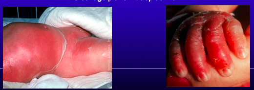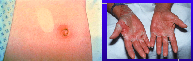 –Febrile, irritable, diffuse blanching erythema with blisters/bullae appearing 1-2 days later starts around the mouth.