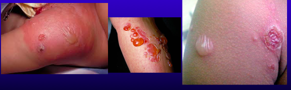 A sequelae of Stpah aureus caused by exfoliative toxins that presents as enlarged vesicles at localized to the site of infection filled with clear, yellow fluid which later becomes darker and more turbid.