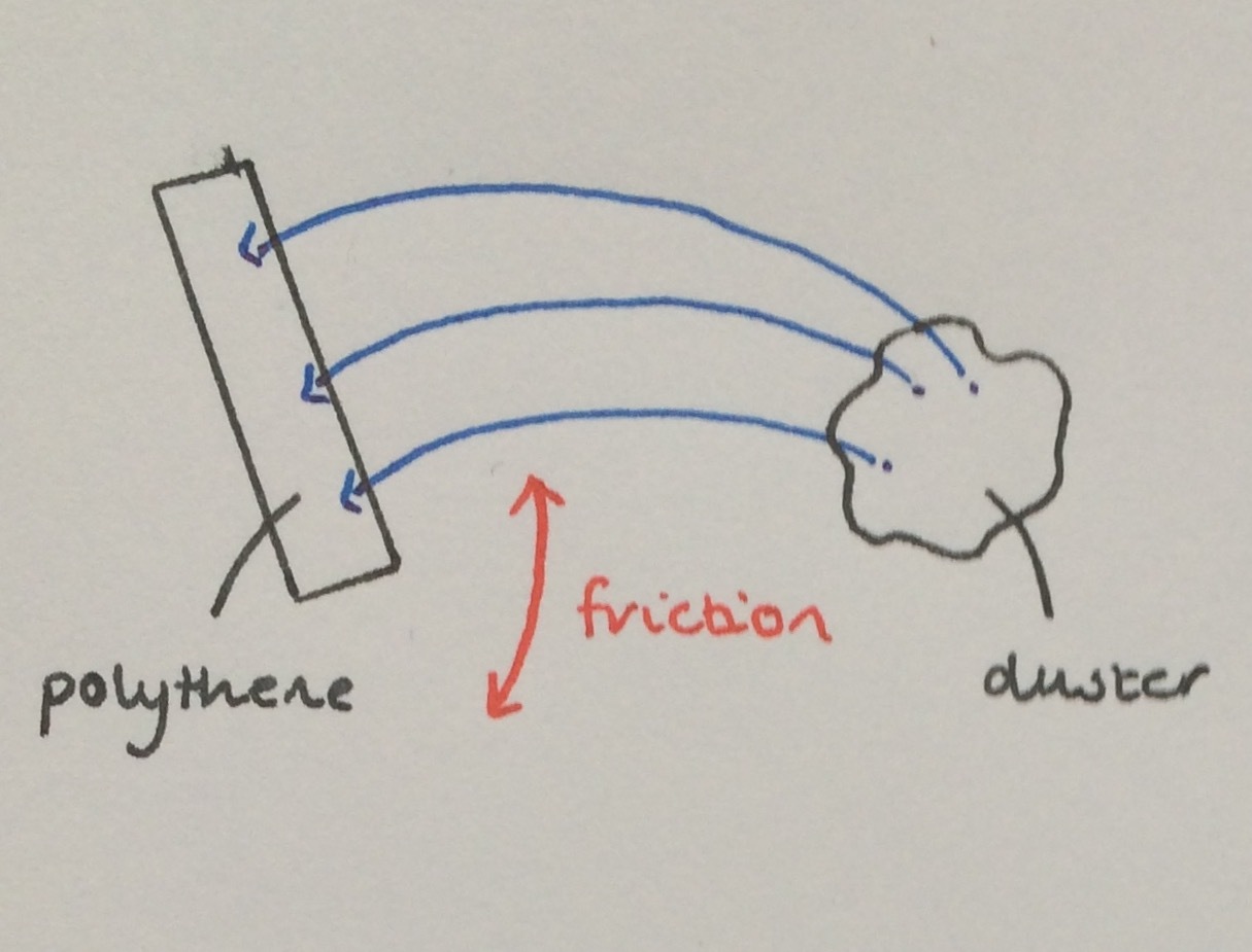 when a polythene rod is rubbed, the friction causes the electrons in the duster to transfer to the polythene rod