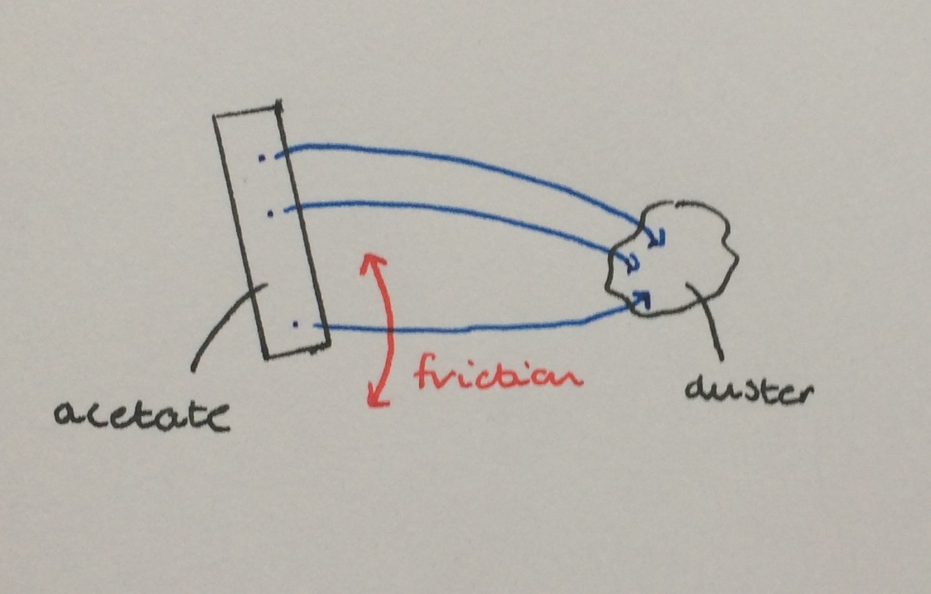 when the acetate rod is rubbed, the friction causes the electrons in the acetate rod to transfer to the duster