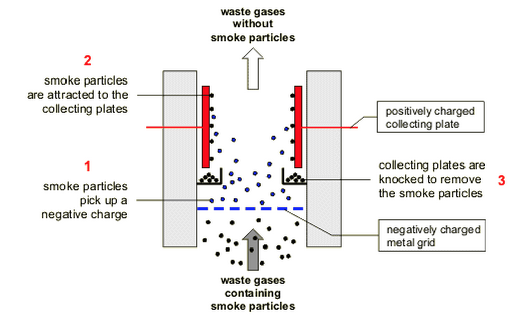 once the plates are knocked, the smoke particles fall into a collector and the clean air passes out through the chimney