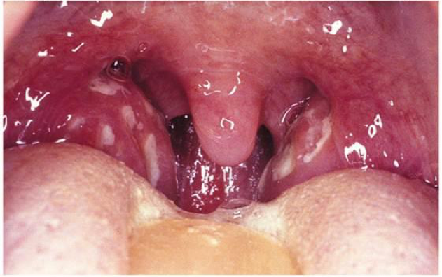 Pharyngitis presents as inflamed tonsils with pharygneal exudate with systemic symptoms of sore throat, fever, N/V, and enlarged cervical lymph nodes