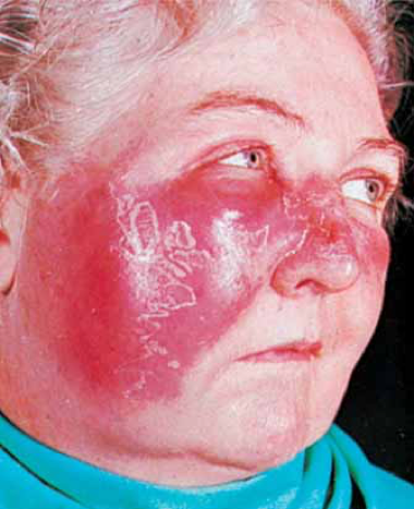 Erysipelas- a complication of GAS infection characterized by rapidly spreading erythematous cutaneous swelling that may begin on the face or, less frequently, on the body or an extremity. The rash has a sharp, well-demarcated, serpiginous border and may form a “butterfly” distribution on the face.