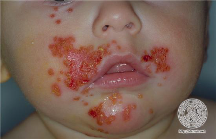 Impetigo- a complication of GAS that is characterized by lesions that begin as papules progressing to vesicles then pustules that rapidly break down to form adherent crusts with golden appearance