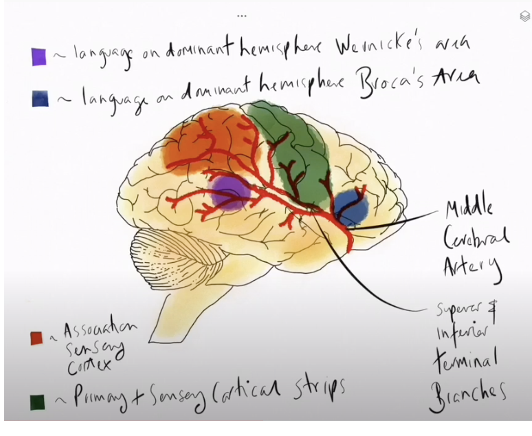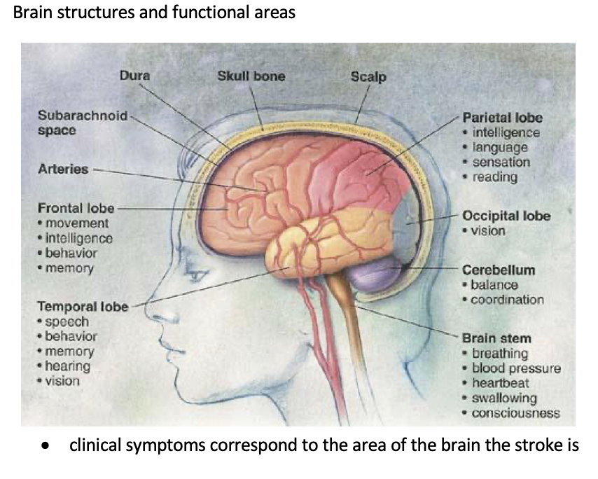 Whta are the major brain structures and functional areas and what do the clinical symptoms of stroke correspond to?