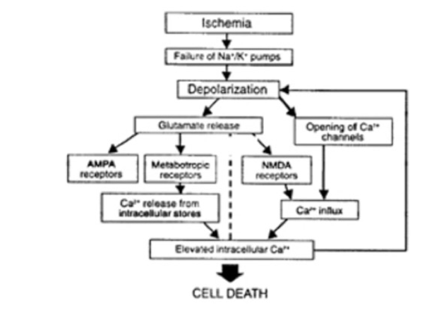 Describe the ischaemic stroke cascade at microscopic level [4]