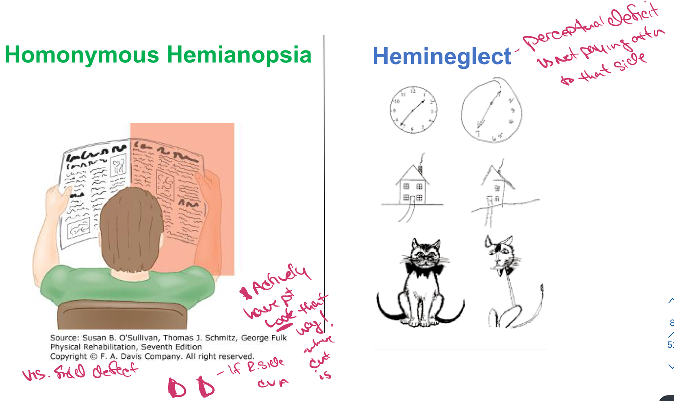 Homonymous Hemianopsia (MCA, PCA) vs Hemineglect (R stroke, MCA, perceptual prob)