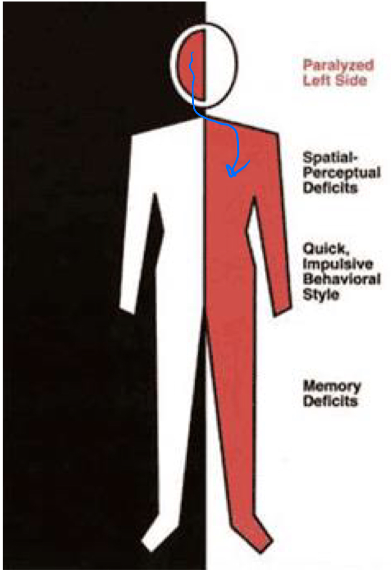 - U/L neglect, depth perception, spatial relations, aGnosia, aPraxia