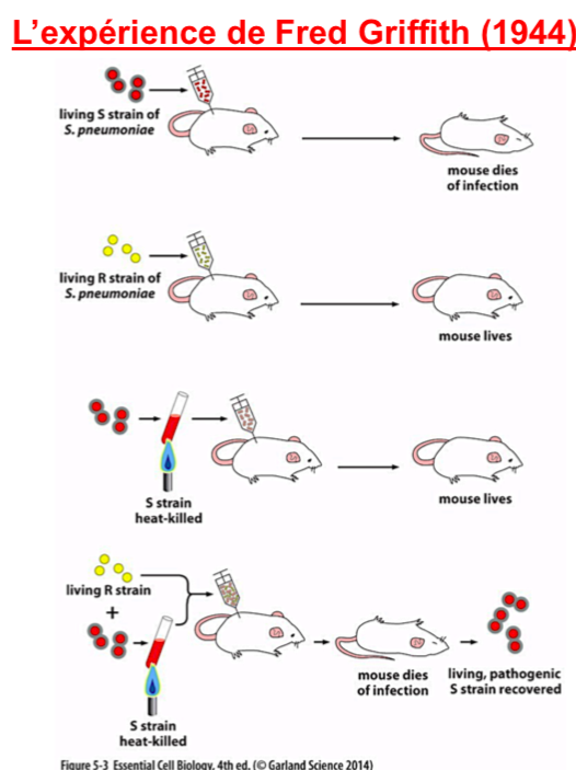 Elle consiste à utiliser 2 souches de la maladie Streptococus pneumoniae: la première souche, dit souche S, est lisse et pathogénique, car elle ne possède pas de capsule protectrice — lorsqu’on l’insère dans le rat il meurt. Pourtant, si on échauffe cette souche (et donc on la tue) avant de l’injecter, le rat ne meurt pas. La deuxième souche est rugueuse, dite souche R, et elle possède la capsule – lorsqu’on l’insère dans le rat, il ne meurt pas. Fred Griffith a remarqué que lorsqu’il mélangeait la souche S chauffée avec la souche R et qu’il injectait le tout dans le rat, le rat mourait toujours. Donc il a pu conclure qu’un des constituants de la souche S pouvait sortir de celle-ci et modifier la souche R.