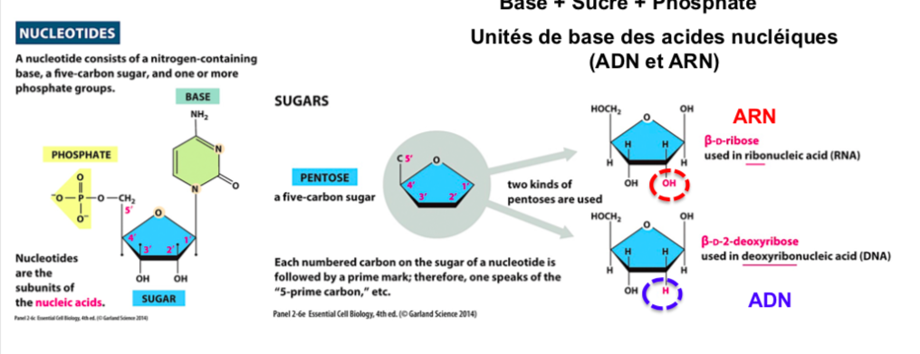 Le deoxyribose est le sucre trouvé dans les ADN et à son carbone 2’, on ne trouve pas de groupe OH, comme sur le ribose. De plus, le ribose est le sucre pour les ARN.