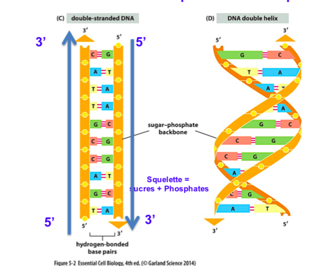 2) Les deux hélices sont appelées des brins et elles ont une polarité 5’—3’