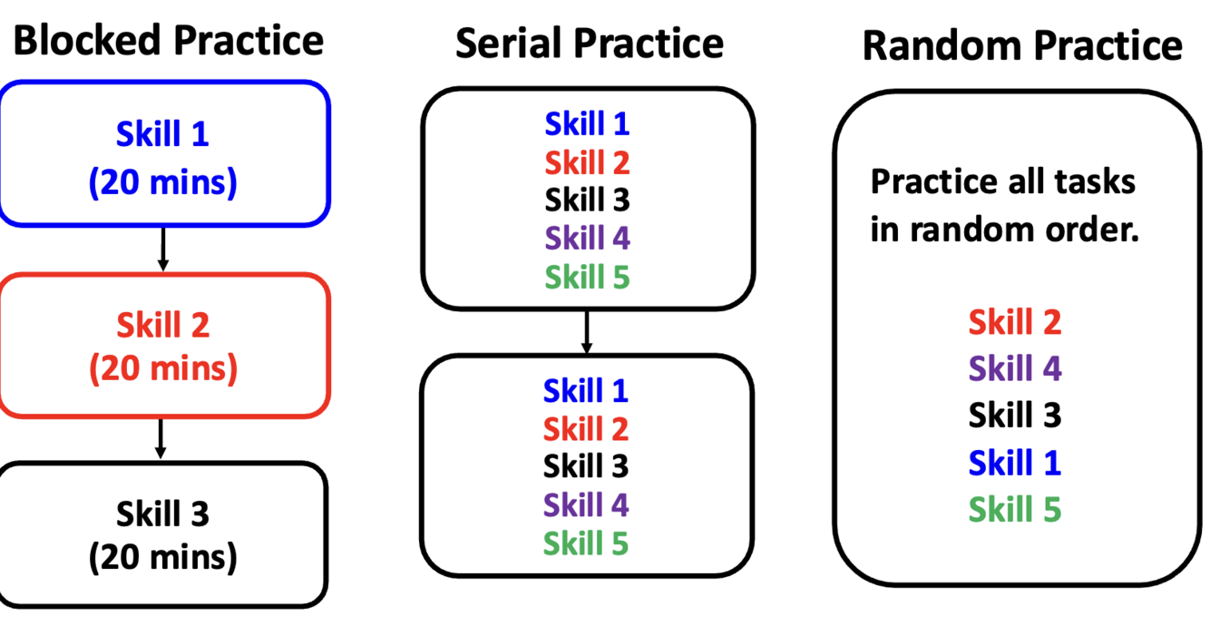 Blocked Practice: All trials of a given task or skill are completed before moving to a new task or skill