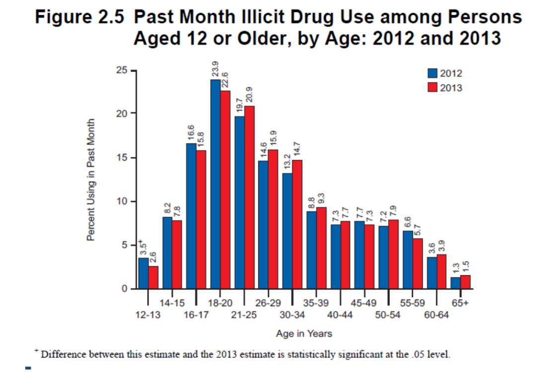 What age range has the largest % of people using illicit drugs?